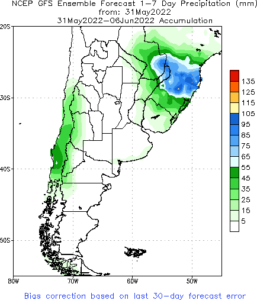 Previsão de Precipitação Argentina, 7 dias, em milímetros.