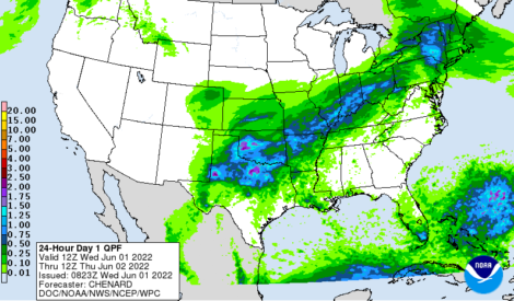 Previsão de Precipitação EUA, 24 horas, em polegadas.