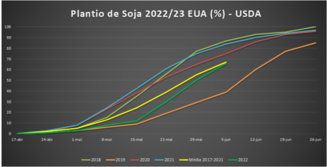 O plantio de soja 2022/23 nos EUA atingiu 66% até domingo, contra 83% do mesmo período do ano passado e 67% da média dos últimos 5 anos, segundo o USDA. Na semana o avanço foi de 16 pontos percentuais. A emergência das plantas está em 39%, contra 59% de 2021 e 43% da média.