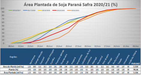 O plantio de soja 2020/21 no Paraná está praticamente finalizado, com 99,58% semeado, segundo a SEAB/Deral. As condições das lavouras tiveram melhora durante a última semana, com as lavouras em boas condições passando de 72% para 75%. A floração atinge 17% das lavouras e o enchimento de grãos 6%. As condições das lavouras do milho 1a safra também tiveram melhora durante a última semana, com as lavouras em boas condições passando de 75% para 77%. A maturação atinge 1% das lavouras.