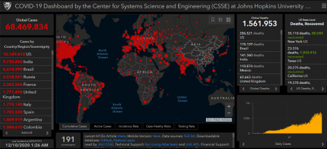 O número de mortos em todo o mundo causados pelo novo coronavírus (COVID-19) subiu para 1.561.953 hoje, de 1.549.332 até ontem, com 68.469.834 casos confirmados. Desde ontem são quase 700.000 novos casos confirmados em todo o mundo. O número de recuperados da pneumonia causada pelo vírus chegou a 44.159.051 hoje, de 43.691.339 até ontem.