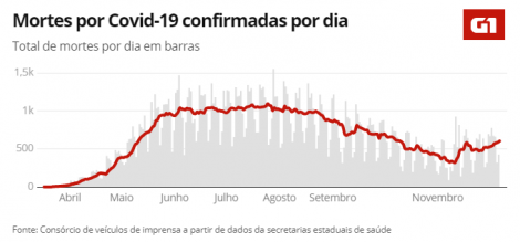 No Brasil, o número de casos de COVID-19 subiu para 6.674.999 hoje, de 6.628.065 até ontem, segundo o consórcio de veículos de imprensa a partir de dados das secretarias estaduais de Saúde. O número de mortos chegou a 178.159, de 177.388 até ontem. O número de pacientes recuperados somam 5.965.492, de 5.801.067 até ontem.