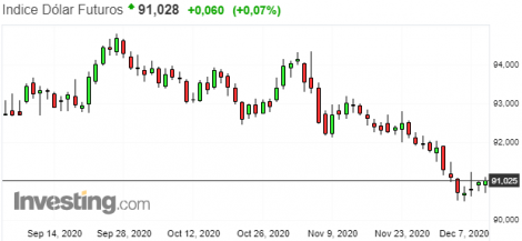 O dólar opera próximo à estabilidade frente a outras moedas. A agência que regulamenta alimentos e remédios nos EUA, o Food and Drug Administration (FDA), confirmou ontem a eficácia e segurança da vacina contra a COVID-19 da Pfizer desenvolvida em parceria com a BioNTech. Em avaliação realizada com 44 mil voluntários de seis países, a vacina teve eficácia de 95% depois da aplicação de duas doses com um intervalo de três semanas.