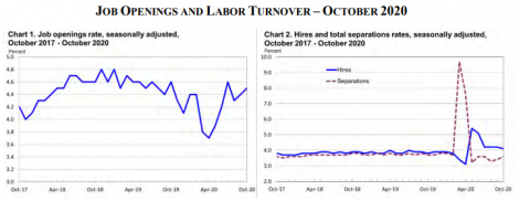 A abertura de postos de trabalho nos EUA foi de 6,652 milhões no último dia útil de outubro, após abertura de 6,494 milhões de vagas em setembro, segundo a pesquisa de vagas de emprego e rotatividade de mão de obra (JOLTS), do Departamento do Trabalho. Houve 5,812 milhões de contratações e 5,107 milhões de demissões em outubro.
