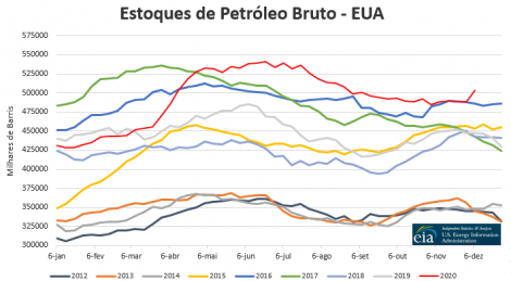 Os futuros do petróleo recuam após forte alta nos estoques dos EUA. Os estoques de petróleo bruto dos EUA subiram 15,189 milhões de barris na semana encerrada no dia 4 de dezembro, para 503,244 milhões, segundo a Agência de Informação de Energia (EIA). A alta contrariou a expectativa dos analistas, que previam recuo de 1,424 milhão de barris no período.