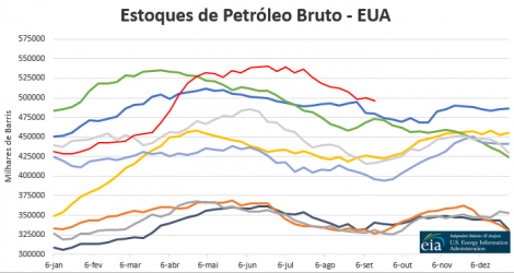Os estoques de petróleo bruto dos EUA recuaram 4,389 milhões de barris na semana encerrada no dia 11 de setembro, para 496,057 milhões de barris, contra 417,144 milhões do mesmo período do ano passado, segundo a Agência de Informação de Energia (EIA). A queda contrariou a expectativa dos analistas, que previam alta de 1,27 milhão de barris no período.