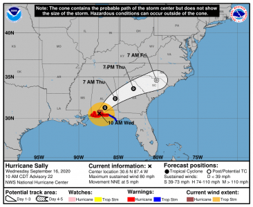 O furacão Sally avança pelo sudeste dos EUA e deve perder força nos próximos dias, quando se dissipará. Sally atingiu a costa como uma tempestade de categoria 2 com ventos sustentados de 105 mph. Desde então, está enfraquecido no interior, com ventos de 80 mph. Com o ritmo lento de Sally, em torno de 3 mph, algumas áreas já coletaram mais de 24 polegadas de chuva e podem receber até 35 polegadas no fim da tempestade.