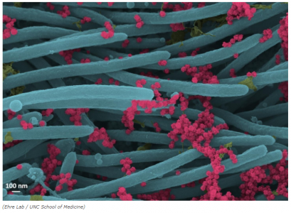 Novas imagens impressionantes do vírus SARS-CoV-2 da bioquímica Camille Ehre da Escola de Medicina da Universidade da Carolina do Norte (UNC) foram publicadas no New England Journal of Medicine; eles revelam o quão bem esses vírions microscópicos podem infectar nossas vias aéreas.