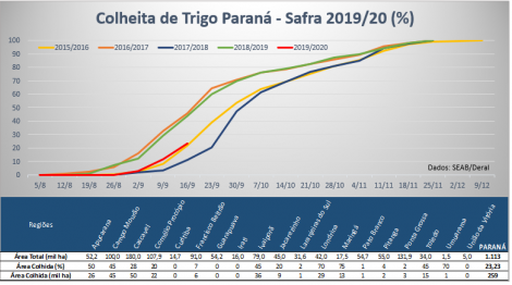 A colheita do trigo 2019/20 no Paraná atingiu 23,23%, levemente atrasado em relação aos anos anteriores. A maturação atinge 60% das lavoras. Do total a ser colhido, 62% das lavouras se encontram em boas condições, 28% em condições médias e 10% em condições ruins.
