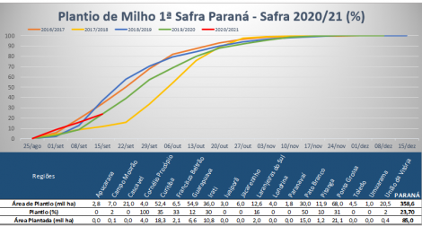 O plantio do milho 1a safra 2020/21 no Paraná atingiu 23,70%, praticamente em linha com a média dos anos anteriores. Do total semeado, 87% se encontram em boas condições e 13% em condições médias.