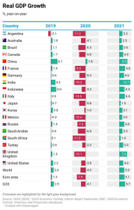 A Organização para a Cooperação e Desenvolvimento Econômico (OCDE) melhorou as projeções de retração das economias globais e prevê contração de 6,5% no PIB do Brasil neste ano, contra 7,4% da estimativa anterior. Para 2021 a projeção é de crescimento de 3,6%. A economia global deve contrair 4,5% neste ano, ante 6% da estimativa anterior, e para 2021 a estimativa é de crescimento de 5%.
