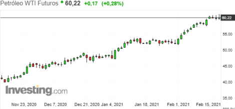 Os futuros do petróleo seguem em alta após uma onda de frio nos EUA que fechar poços de extração de petróleo no estado do Texas.