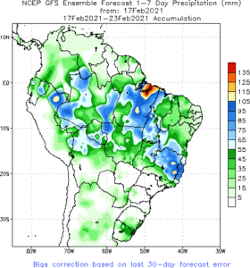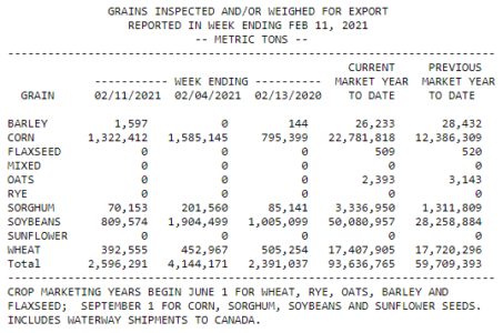 Os embarques semanais de soja dos EUA foram de 809 mil toneladas na semana encerrada no dia 11 de fevereiro, contra 1,9 milhão da semana anterior e 1 milhão do mesmo período do ano passado, segundo o USDA. Na temporada os embarques de soja dos EUA somam 50,08 milhões de toneladas, contra 28,26 milhões do mesmo período da temporada anterior. Os embarques de milho foram de 1,32 milhão de toneladas, contra 1,58 milhão da semana anterior e 795 mil do mesmo período de 2020. Na temporada as vendas de milho somam 22,78 milhões de toneladas, contra 12,39 milhões do mesmo período da temporada 2019/20.