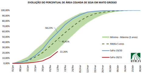 A colheita de soja 2020/21 no Mato Grosso atingiu 22,26% até sexta-feira, contra 58,22% do mesmo período do ano passado e 45,41% da média dos últimos 5 anos, segundo o IMEA.