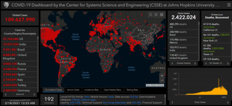 O número de mortos em todo o mundo causados pelo novo coronavírus (COVID-19) subiu para 2.422.024 hoje, de 2.372.399 até sexta-feira, com 109.627.990 casos confirmados. Desde sexta-feira são quase 1.700.000 novos casos confirmados. O número de recuperados da pneumonia causada pelo vírus chegou a 61.687.436, de 60.421.571 até sexta-feira.