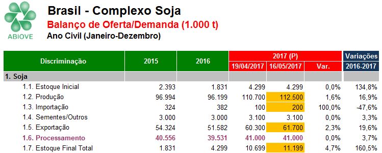A ABIOVE elevou a estimativa de produção de soja do Brasil de 110,7 milhões para 112,5 milhões de toneladas, com as exportações passando de 60,3 milhões para 61,7 milhões de toneladas.