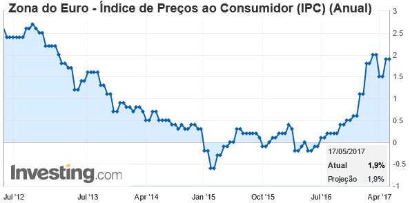 A inflação ao consumidor da zona do euro, medido pelo índice de preços ao consumidor (CPI) subiu 1,9% na comparação anual de abril, ante aumento de 1,5% observado em março, segundo dados finais divulgados hoje pela Eurostat. Com isso a inflação na zona do euro ficou em linha com a meta do Banco Central Europeu (BCE), que é de uma taxa ligeiramente inferior a 2,0%. Apenas o núcleo do CPI do bloco, que exclui os preços de energia e de alimentos, registrou alta de 1,2% na comparação anual de abril.
