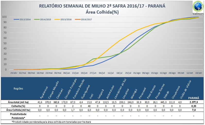 A colheita do milho 2ª safra iniciou no Paraná em algumas lavouras nas regiões de Irati e Francisco Beltrão, com 7,8 mil hectares colhidos dos 2,378 milhões estimados para esta safra.