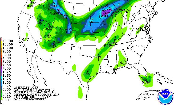 Previsão de precipitação EUA, 24 horas, em polegadas.