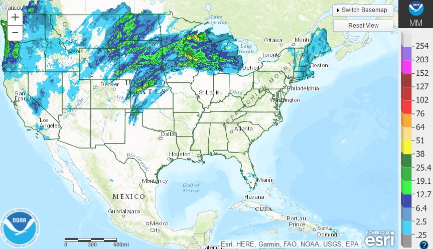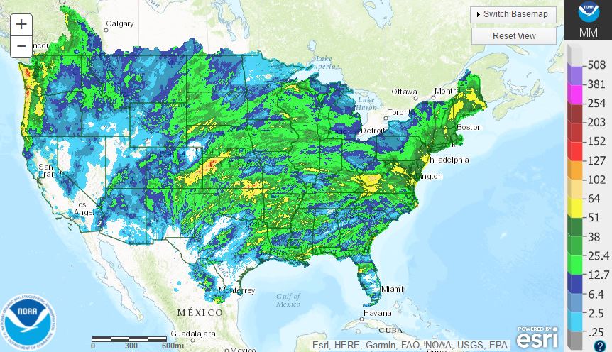 Precipitação Observada EUA, 24 horas, em milímetros.