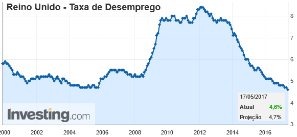 A taxa de desemprego do Reino Unido caiu para 4,6% no trimestre até março, atingindo o menor nível desde meados de 1975, segundo dados da ONS. O resultado veio melhor do que o esperado pelos analistas. No período de janeiro a março, o número de desempregados no Reino Unido registrou queda de 53 mil.
