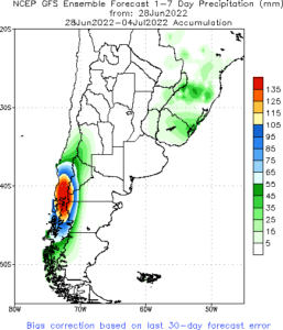 Previsão de Precipitação Argentina, 7 dias, em milímetros.