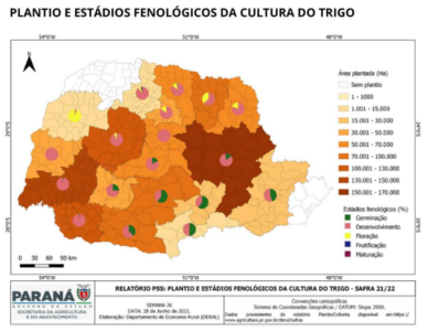 O plantio do trigo 2021/22 no Paraná atingiu 88%, com avanço semanal de 6 pontos percentuais. As lavouras seguem com 97% em boas condições e 3% em condições médias.