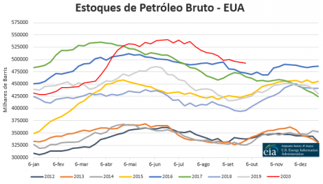 Os estoques de petróleo bruto dos EUA recuaram 1,98 milhão de barris na semana encerrada no dia 25 de setembro, para 492,438 milhões de barris, segundo a Agência de Informação de Energia (EIA). O recuo contrariou a expectativa dos analistas, que previam alta de 1,57 milhão de barris no período. Os estoques de gasolina subiram e os de destilados recuaram 3,18 milhões de barris.