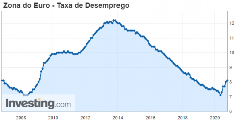 A taxa de desemprego na Zona do Euro subiu para 8,1% em agosto, de 8,0% em julho, segundo a Eurostat. O número veio em linha com o esperado. O setor industrial da zona do euro subiu para 53,7 em setembro, de 51,7 em agosto, segundo o Índice de Gerentes de Compras (PMI) do IHS Markit