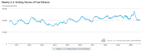 A produção semanal de etanol de milho nos EUA caiu para 881 mil barris diários na semana encerrada no dia 25 de setembro, de 906 mil da semana anterior, segundo a Agência de Informação de Energia (EIA). Os estoques caíram de 19,997 milhões para 19,691 milhões de barris, contra 23,219 milhões do mesmo período do ano passado.