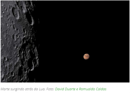 3 de outubro: ocultação de Marte pela Lua. O par surgirá próximo no horizonte por volta das 19h10 (olhe para o leste) do dia 2, e ficará cada vez mais próximo ao longo da noite até o planeta se esconder completamente atrás de nosso satélite às 00h25 do dia 3, quanto estarão ao noroeste.