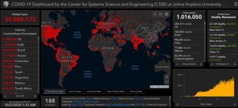 O número de mortos em todo o mundo causados pelo novo coronavírus (COVID-19) subiu para 1.016.050 hoje, de 1.009.593 até ontem, com 34.080.123 casos confirmados. Desde ontem são quase 350.000 novos casos confirmados em todo o mundo. O número de recuperados da pneumonia causada pelo vírus chegou a 23.691.260 hoje, de 23.441.266 até ontem.