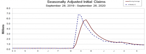 Os pedidos iniciais de auxílio-desemprego nos EUA recuaram 36.000 pedidos na semana encerrada no dia 26 de setembro, para taxa sazonalmente ajustada de 837.000 pedidos, segundo o Departamento de Trabalho. A média móvel de 4 semanas recuou 11.750 pedidos, a 867.250 pedidos. A taxa de desemprego caiu 0,6 ponto percentual na semana encerrada no dia 19 de setembro, para 8,1%.
