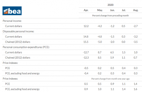 A renda pessoal nos EUA diminuiu US$543,5 bilhões (2,7%) em agosto, de acordo com Departamento de Análises Econômicas (BEA). A renda pessoal descartável (DPI) diminuiu US$570,9 bilhões (3,2%) e as despesas de consumo pessoal (PCE) aumentaram US$141,1 bilhões (1,0%). O DPI real diminuiu 3,5% em agosto e o PCE real aumentou 0,7%. O índice de preços PCE aumentou 0,3%. Excluindo alimentos e energia, o índice de preços PCE aumentou 0,3%.