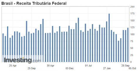 A arrecadação do governo federal cresceu 1,33% em agosto na comparação anual, para US$124,505 bilhões, segundo a Receita Federal. A alta veio maior do que a esperada pelo mercado que era de US$109 bilhões.