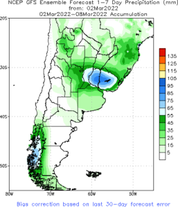 Previsão de Precipitação Argentina, 7 dias, em milímetros.