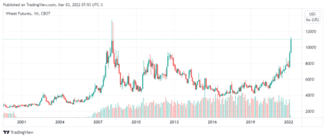O trigo dispara pelo 4o pregão seguido, acumulando alta de 180 pontos até o momento e renovando máximas de março de 2008.