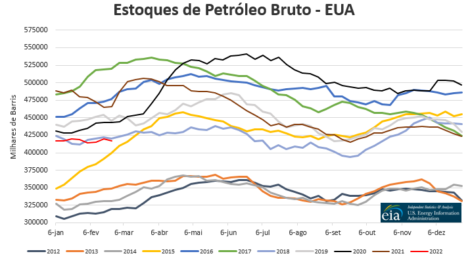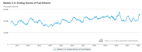 A produção semanal de etanol de milho nos EUA caiu para 997 mil barris diários na semana encerrada no dia 25 de fevereiro, contra 849 mil do mesmo período do ano passado, segundo a Agência de Informação de Energia (EIA). Os estoques caíram de 25,507 milhões para 24,933 milhões de barris, contra 22,425 milhões do mesmo período de 2021.