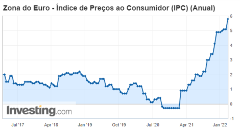 A inflação ao consumidor da zona do euro subiu 0,9% em fevereiro, após alta de 0,3% em janeiro, segundo a Eurostat. Na comparação anual a inflação da zona do euro acelerou para 5,8% em fevereiro, de 5,1% em janeiro, para o maior nível da série histórica, iniciada em 1997.