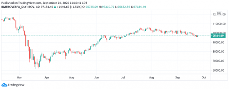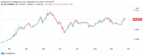 No Brasil o dólar passa a recuar após chegar aos R$5,6238 na máxima da sessão. Ontem a moeda subiu 2,16%, a R$5,5864. O Banco Central (BC) revisou a projeção de retração da economia deste ano para 5%, de 6,4% da estimativa de julho. “A recomposição da renda e os demais programas do governo vêm permitindo que a economia brasileira se recupere relativamente mais rápido que a dos demais países emergentes; Apesar do forte recuo da atividade no segundo trimestre, o conjunto de indicadores disponíveis mostra que a retomada da atividade econômica após a fase mais aguda da pandemia, ainda que parcial, está ocorrendo mais rapidamente do que antecipado, contribuindo para a elevação da estimativa de crescimento anual”, informou o BC. Para a inflação, a projeção do BC é de alta de 2,1%, ante 2,4% da estimativa anterior. O BC reduziu também a estimativa de ingresso de investimentos estrangeiros diretos no país neste ano de US$ 55 bilhões para US$ 50 bilhões, o menor valor em 11 anos. Nos oito primeiros meses deste ano os investimentos estrangeiros diretos somaram US$ 26,957 bilhões, um recuo de 41% frente ao mesmo período de 2019.