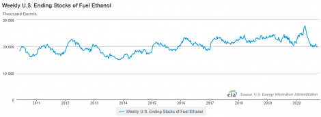 A produção semanal de etanol de milho nos EUA caiu para 906 mil barris diários na semana encerrada no dia 18 de setembro, de 926 mil da semana anterior, segundo a Agência de Informação de Energia (EIA). Já os estoques subiram de 19,798 milhões para 19,997 milhões de barris, contra 21,364 milhões do mesmo período de 2019.