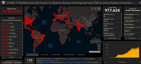 O número de mortos em todo o mundo causados pelo novo coronavírus (COVID-19) subiu para 977.624 hoje, de 972.372 até ontem, com 31.937.244 casos confirmados. Desde ontem são mais de 250.000 novos casos confirmados em todo o mundo. O número de recuperados da pneumonia causada pelo vírus chegou a 22.013.874 hoje, de 21.785.468 até ontem.