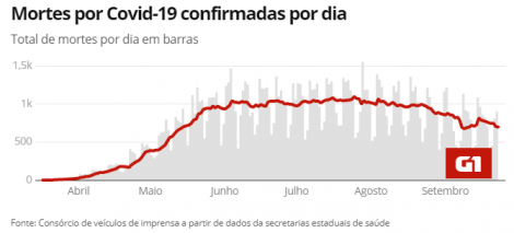 No Brasil, o número de casos de COVID-19 subiu para 4.627.780 hoje, de 4.591.604 até ontem, segundo o consórcio de veículos de imprensa a partir de dados das secretarias estaduais de Saúde. O número de mortos chegou a 139.065, de 138.108 até ontem. O número de pacientes recuperados somam 3.992.886, de 3.945.627 até ontem.