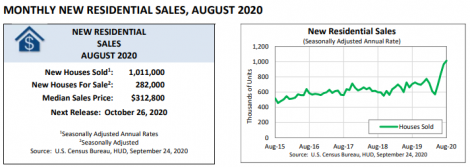 As vendas de novas residências nos EUA cresceram 4,8% em agosto ante julho, para taxa sazonalmente ajustada de 1,011 milhão, para o maior nível em quase 14 anos, segundo o Departamento de Comércio. Em relação a agosto de 2019 o crescimento foi de 43,2%.