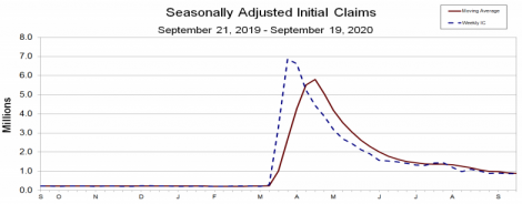 Os pedidos iniciais de auxílio-desemprego nos EUA subiram 4.000 pedidos na semana encerrada no dia 19 de setembro, para número ajustado de 870.000 pedidos, segundo o Departamento de Trabalho (DoL). A média móvel de 4 semanas caiu 32.250 pedidos, para 878.250 pedidos. A taxa de desemprego recuou 0,1 ponto percentual na semana encerrada no dia 12 de setembro, para 8,6%.