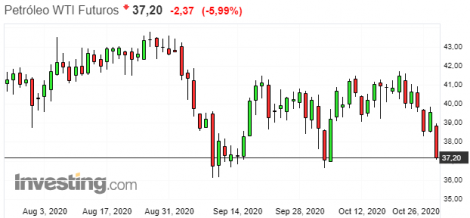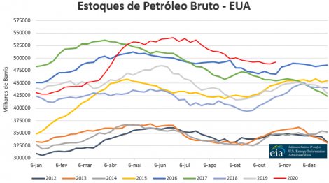 Os estoques de petróleo bruto dos EUA subiram 4,32 milhões de barris na semana encerrada no dia 23 de outubro, para 492,440 milhões de barris, segundo a Agência de Informação de Energia (EIA). A alta veio maior do que a esperada, que era de 1,23 milhão de barris. Já os estoques de gasolina recuaram 892 mil barris e os de destilados recuaram 4,49 milhões de barris no período.