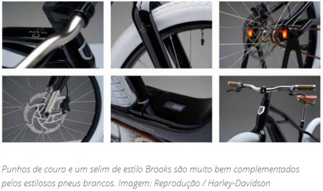 Além disso, seu design conta com faróis integrados e lanternas traseiras, rodas com freios a disco hidráulicos de pistão duplo Tektro em rotores de 203 mm, selim estilo Brooks e punhos de couro.