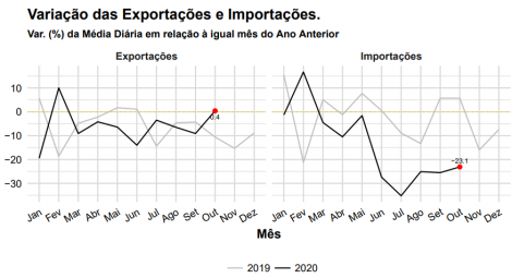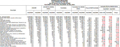 A balança comercial brasileira registrou superávit de US$ 1,579 bilhão e corrente de comércio de US$ 7,628 bilhões na 4ª semana de Outubro de 2020, resultado de exportações no valor de US$ 4,604 bilhões e importações de US$ 3,025 bilhões. No mês, as exportações somam US$ 14,3 bilhões e as importações, US$ 9,523 bilhões, com saldo positivo de US$ 4,777 bilhões e corrente de comércio de US$ 23,824 bilhões. No ano, as exportações totalizam US$ 170,824 bilhões e as importações, US$ 123,858 bilhões, com saldo positivo de US$ 46,966 bilhões e corrente de comércio de US$ 294,682 bilhões.