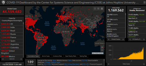 O número de mortos em todo o mundo causados pelo novo coronavírus (COVID-19) subiu para 1.169.562 hoje, de 1.161.740 até ontem, com 44.159.482 casos confirmados. Desde ontem são 500.000 novos casos confirmados em todo o mundo. O número de recuperados da pneumonia causada pelo vírus chegou a 29.870.836 hoje, de 29.267.549 até ontem.