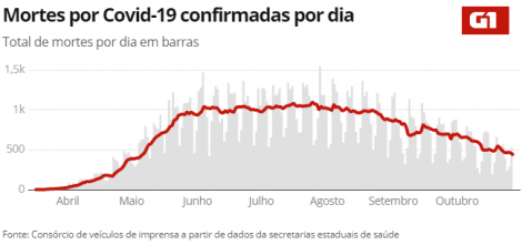 No Brasil, o número de casos de COVID-19 subiu para 5.440.903 hoje, de 5.411.550 até ontem, segundo o consórcio de veículos de imprensa a partir de dados das secretarias estaduais de Saúde. O número de mortos chegou a 157.981, de 157.451 até ontem. O número de pacientes recuperados somam 4.904.046, de 4.865.930 até ontem.